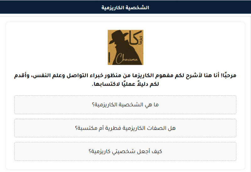 ما يميز الشخصية الكاريزمية هو قدرته على فهم احتياجات المستخدمين بدقة، وتقديم إجابات شاملة ومفصلة بلغة عربية سليمة. سواء كنت بحاجة إلى مساعدة في كتابة مقال، أو صياغة تقرير، أو حتى استشارة تقنية، فإن هذا المساعد يقدم الحلول بكل ثقة واحترافية.