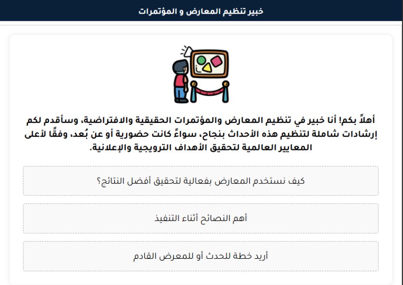 في عالم تتسارع فيه وتيرة الأحداث والمؤتمرات، يبرز مساعد ذكي مبتكر ليصبح دليلك الأمثل نحو تنظيم فعاليات ناجحة ومؤثرة. إنه "خبير تنظيم المعارض والمؤتمرات"، أحد أبرز أعضاء جيش المساعدين الأذكياء في منتدى الذكاء الاصطناعي .