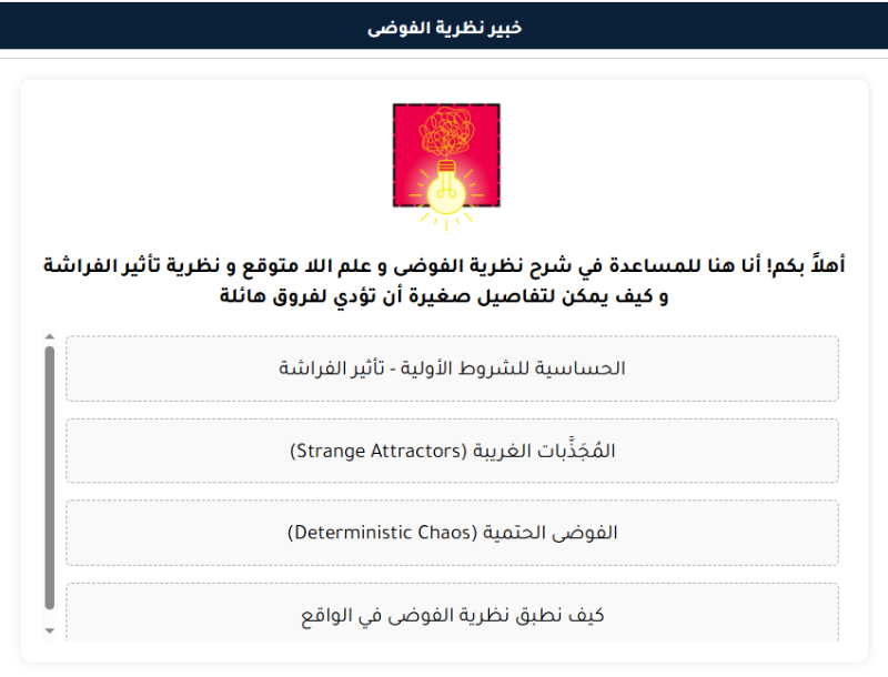 تحت اسم "خبير نظرية الفوضى". هذا المساعد المتخصص يحمل رؤية ثورية لفهم الأنظمة المعقدة، حيث يقدم تحليلات عميقة للظواهر التي تبدو عشوائية في ظاهرها لكنها تخفي أنماطاً خفية في جوهرها.