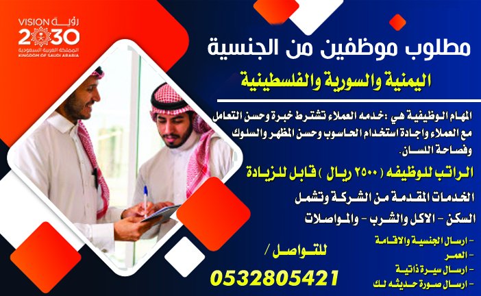 مطلوب موظفين من الجنسية اليمنية والسورية والفلسطينية
