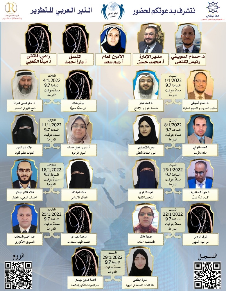 ترقبوا الانطلاق في 1/1/2022 ﻷمسيات و ندوات ثقافية و علمية مجانية رائعة في *المنبر العربي للتطوير*