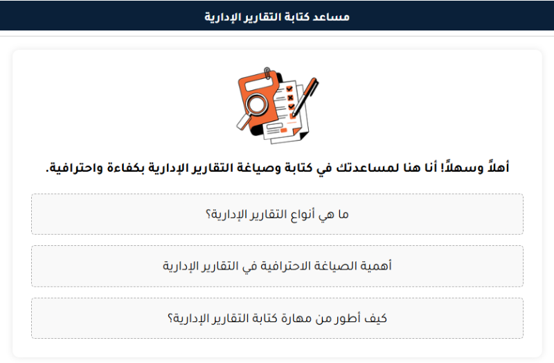 مع مساعد كتابة التقارير الإدارية، تصبح العملية الكتابية أكثر سلاسة واحترافية، مما يسهم في تحقيق التميز الإداري والارتقاء بمستوى الأداء المؤسسي.