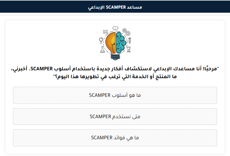 كحليف استراتيجي للمبدعين والمبتكرين. ومن بين هذه المساعدات المتخصصة، يأتي مساعد SCAMPER الإبداعي ليمثل نقلة نوعية في منهجيات التفكير الإبداعي.