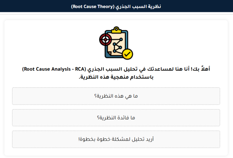 يمثل هذا المساعد نقلة نوعية في كيفية تعاملنا مع المشكلات، حيث يحول التفكير العشوائي إلى عملية منهجية منظمة. انضم إلى جيش المساعدين الأذكياء واكتشف كيف يمكن لـ "نظرية السبب الجذري" أن يغير طريقة تفكيرك في حل المشكلات.