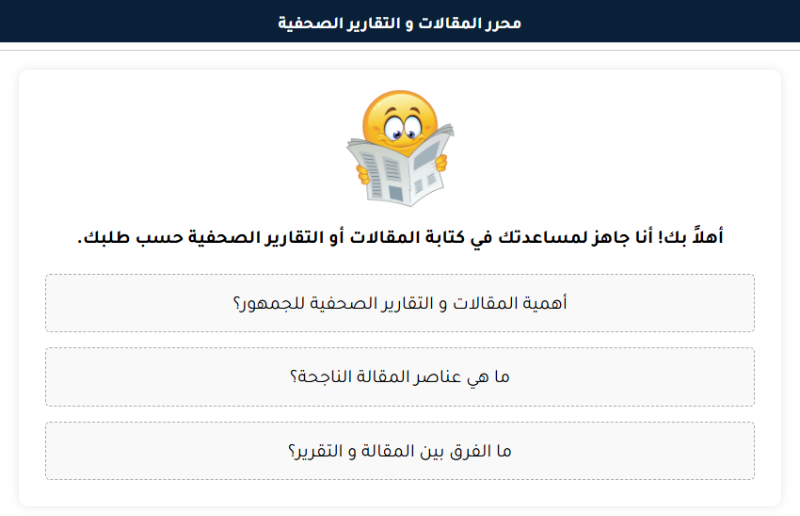 هذا المساعد الذكي يمثل نقلة نوعية في عالم الصحافة والكتابة الإعلامية، حيث يقدم حلولا متكاملة للكتاب والصحفيين والمحررين. يتميز بقدرته على صياغة المقالات والتقارير الصحفية باحترافية عالية، مع الحفاظ على الدقة اللغوية والأسلوب الصحفي الرصين.